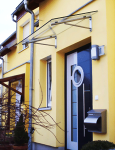 Modern und zeitgemäß ist unser Glas-Edelstahl-Vordach "Edition Pure" aus hochwertigem Verbund-Sicherheitsglas (VSG) TVG 12 mm mit eleganten Edelstahlhalter.